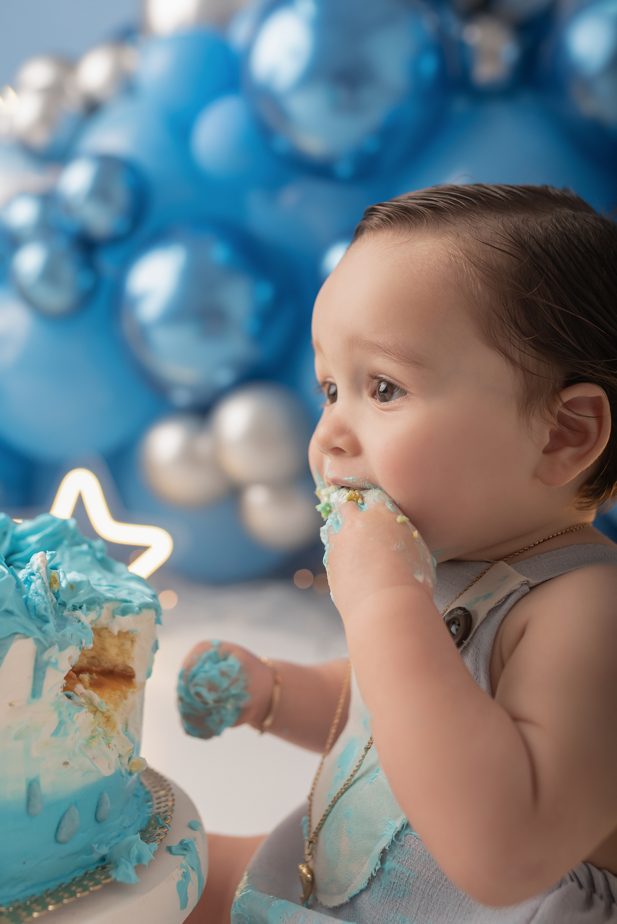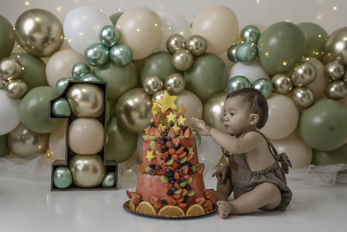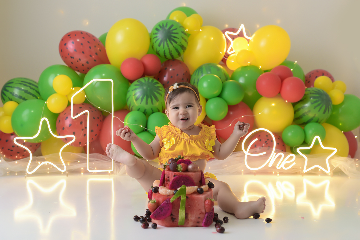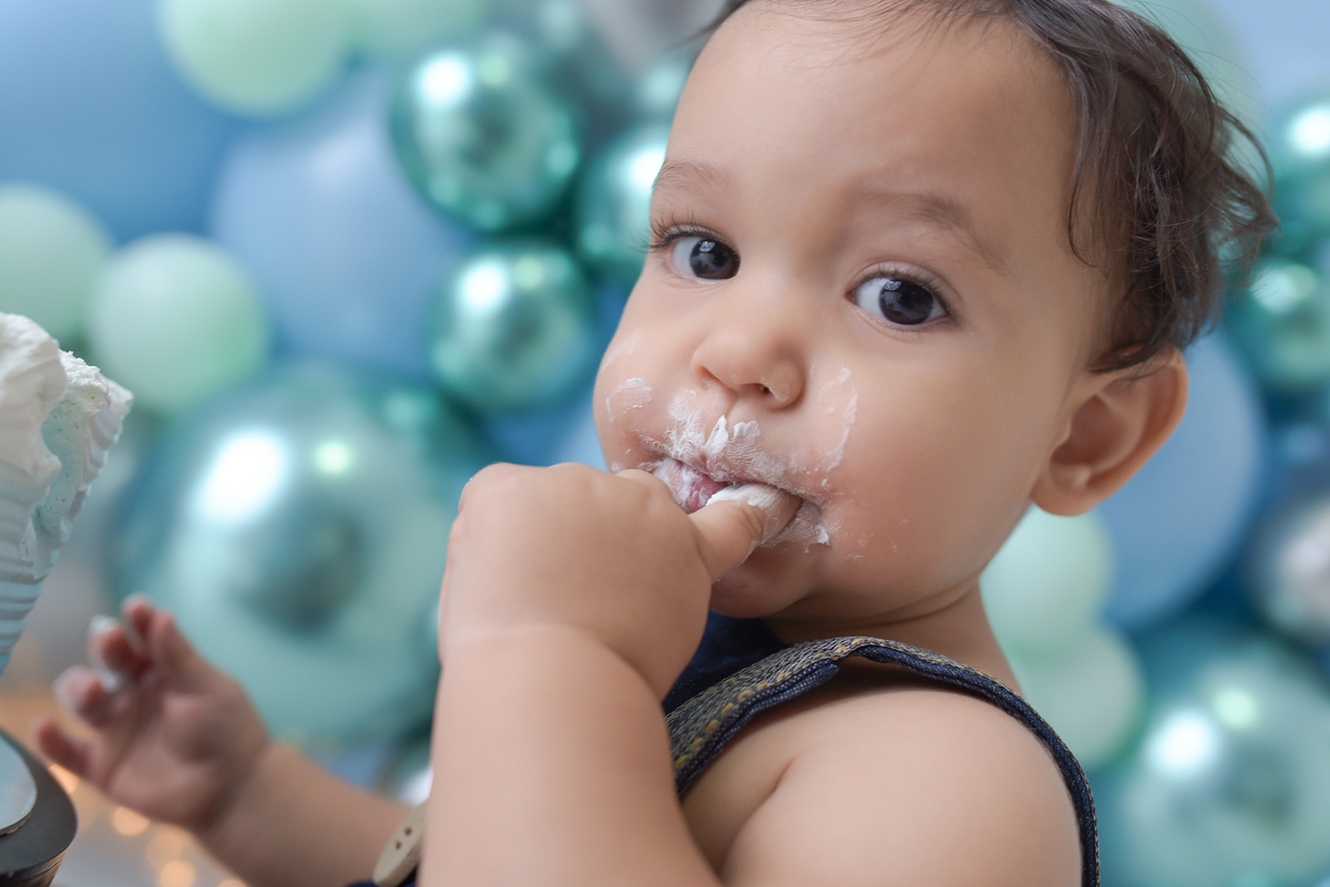 A segunda etapa é a baguncinha com o bolo/ou fruta, onde o bebê faz aquela festa rendendo fotos incríveis.